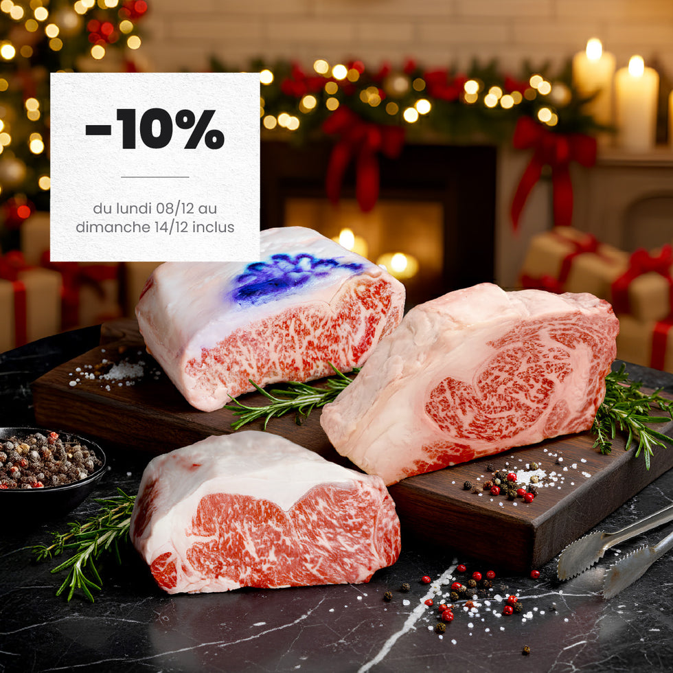 –10% sur nos bœufs d’origine traditionnelle japonaise : Wagyu, Kobé et Kagoshima. Trois races incontournables réputées pour leur persillage exceptionnel et leur fondant inégalé.