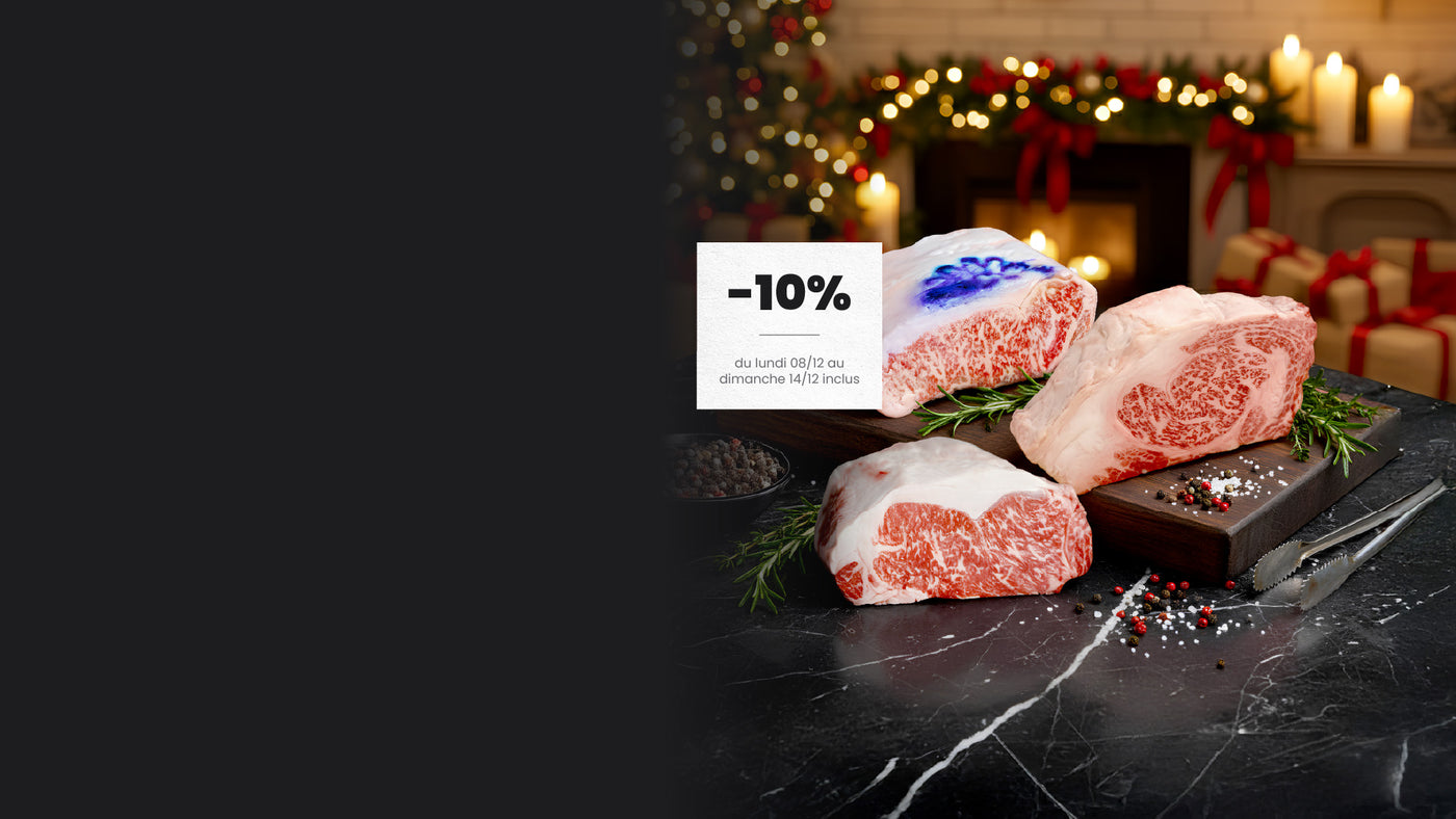–10% sur nos bœufs d’origine traditionnelle japonaise : Wagyu, Kobé et Kagoshima. Trois races incontournables réputées pour leur persillage exceptionnel et leur fondant inégalé.