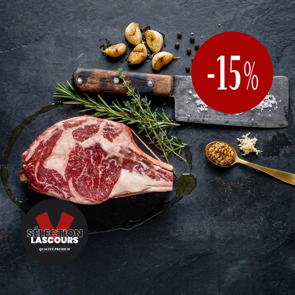 Ce mois-ci, la Rubia Gallega est à -15%. Élevée en plein air en Galice, elle développe un persillage généreux et un gras jaune fondant qui en font l'une des viandes bovines les plus réputées au monde.