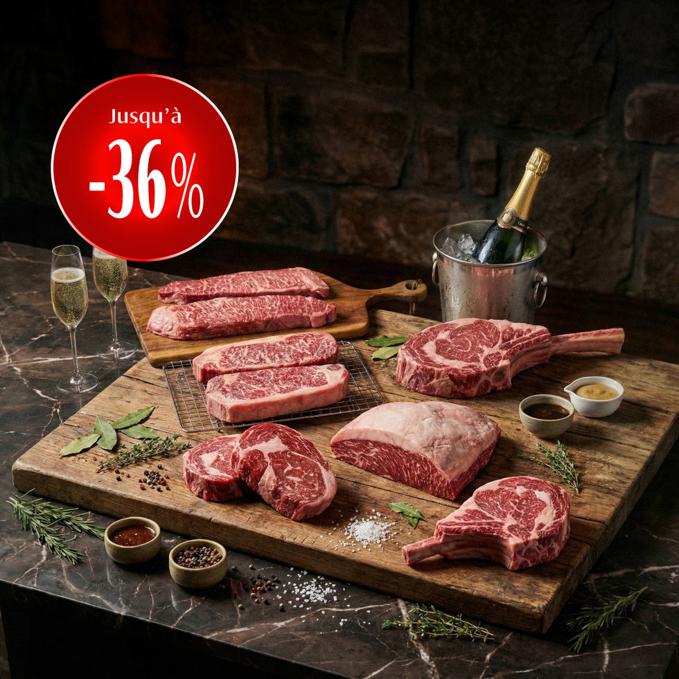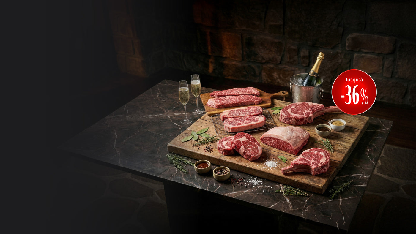 Wagyu, Kobe, Black Angus et autres viandes premium en promotion jusqu’à -36%, ainsi qu’une sélection de traiteur festif prête à servir.