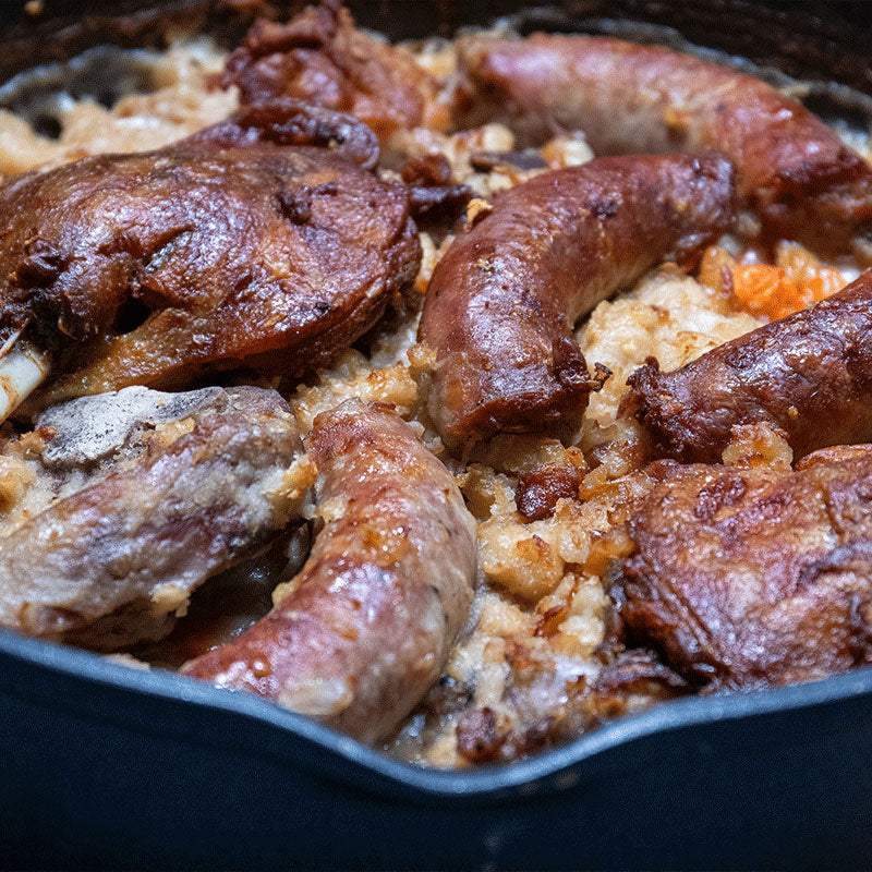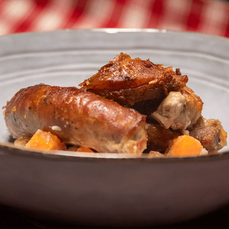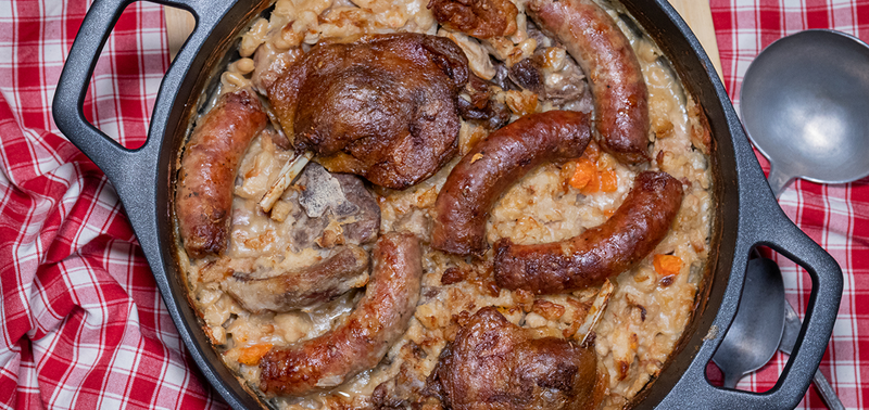 Une recette emblématique, le cassoulet est le plat traditionnel de la région Sud-Ouest. Le cassoulet Maison Lascours combine haricots fondants, des cuisses de canard confites, de la saucisse de Toulouse, de l'échine de porc et de la ventrèche de porc. Un plat généreux et savoureux, qui réchauffe les papilles.