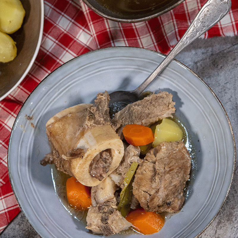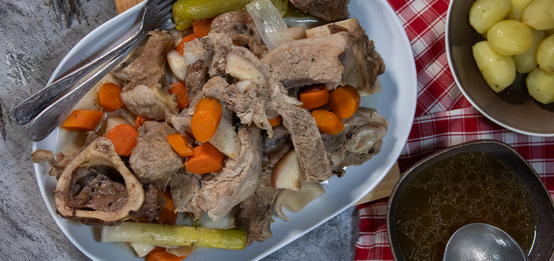 Une variante de la traditionnelle recette du pot-au-feu, toute aussi gourmande que savoureuse. La viande de veau est mijotée lentement ce qui se marie parfaitement avec les légumes et les arômes des herbes aromatiques.