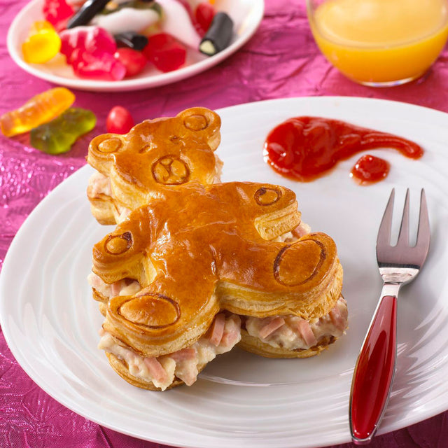 Ces petits feuilletés en forme d’ourson allient la douceur du jambon au fondu du fromage dans une pâte dorée et croustillante.