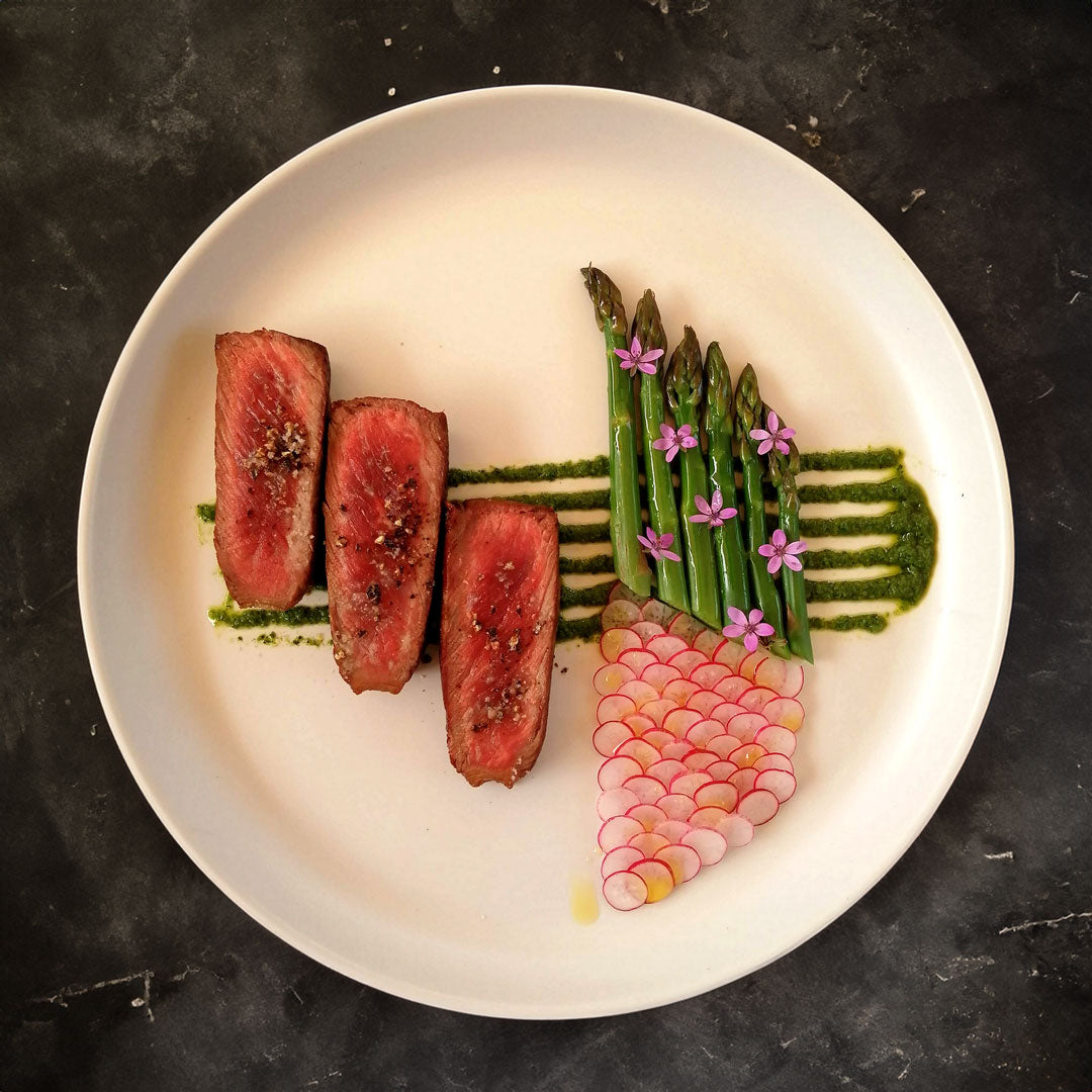 Le faux-filet se distingue par sa texture ferme mais fondante, et par sa capacité à révéler les différences de race, lorsqu’il est dégusté à l’aveugle. Celui de bœuf Normand impose son style : mâche franche, gras expressif, chair rouge soutenue, sans masquer la subtilité de son élevage.