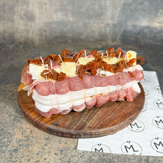 Le veau est roulé autour d'une farce aux inspirations italiennes, on y retrouve de la tomate séchée, du basilic, ainsi que du parmesan pour apporter un goût gourmand à la préparation. Le rôti est ensuite bardé avec une barde de porc pour le maintenir.