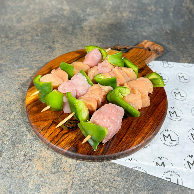 Nos brochettes de volailles sont élaborées chaque jour par nos bouchers à partir de poulet sélectionné pour sa texture fondante et sa qualité. Découpés en généreux morceaux, ils sont piqués sur des brochettes en bois et séparés par des lamelles de poivrons rouges, jaunes ou verts, pour apporter à la fois douceur et éclat à vos assiettes.