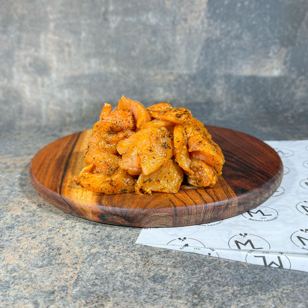 Préparés à partir de viande de poulet et de dinde découpée par nos bouchers, ces émincés sont marinés dans un mélange savoureux à base de tomates et d’herbes de Provence. Chaque bouchée vous transporte au cœur des côtes méditerranéennes, avec des notes parfumées et chaleureuses qui subliment la tendreté de la volaille.