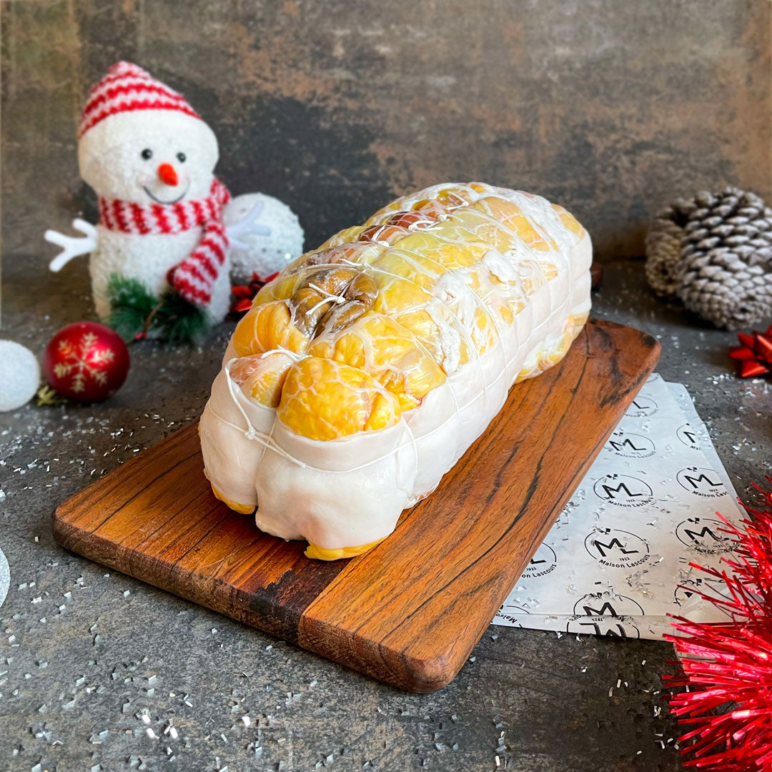 Entièrement désossé, il est garni d’une farce à base de viande de volaille et de champignons forestiers, puis bardé pour conserver tout son moelleux à la cuisson.